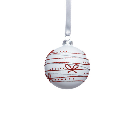Matte Glass Ornament - White w/ Red Ribbon Design