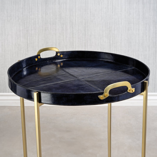 Savoy Leather w/ Brass Handles Round Tray on Stand - Blue and Gold