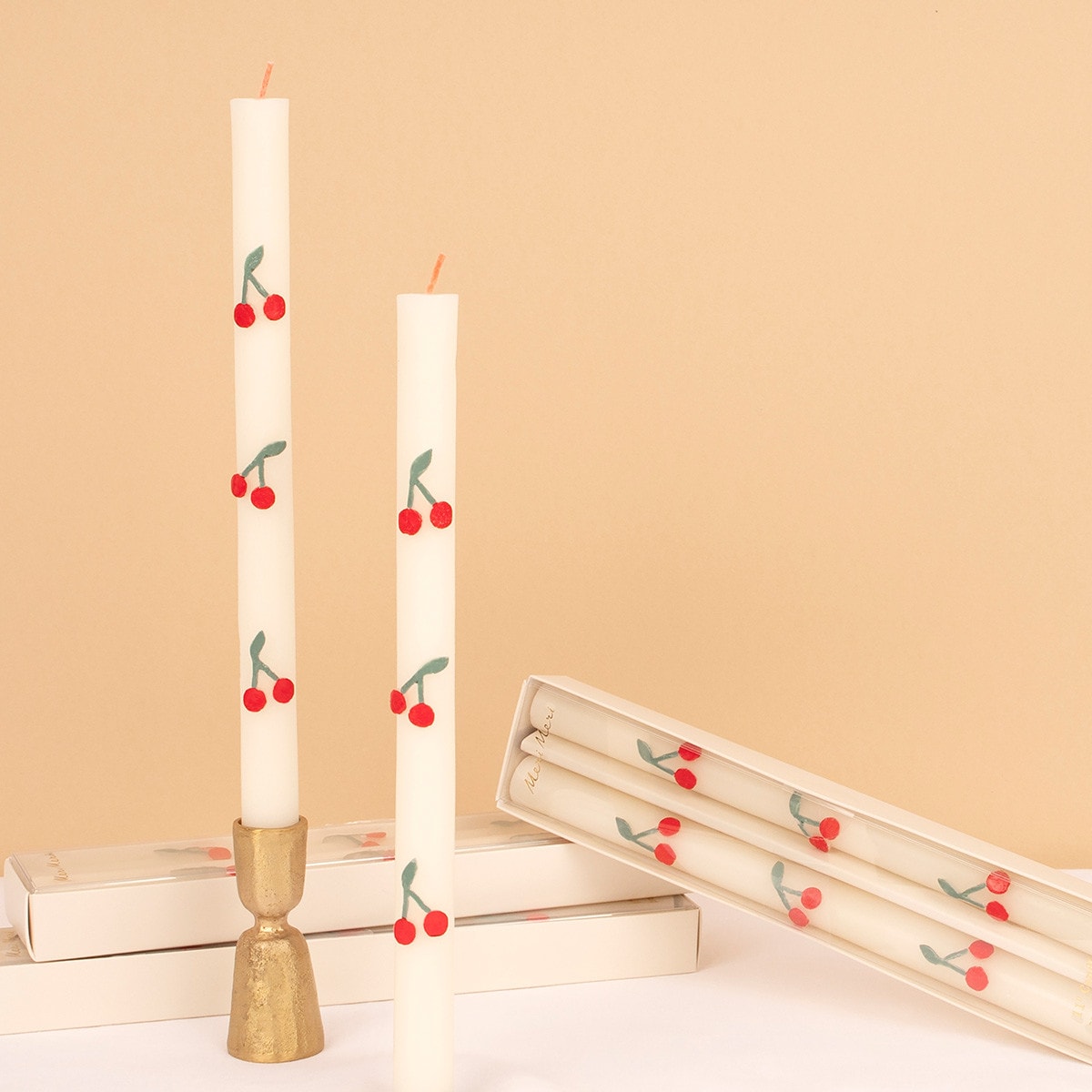 Add a sweet touch to any occasion with these Cherry Taper Candles. Each unscented taper candle features a fun cherry design, bringing a playful vibe to your decor. Perfect for parties, romantic dinners, or just adding a pop of color to your home. (Cherry-scented not included!)