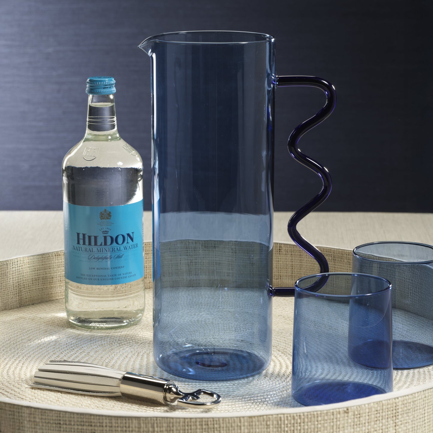 This striking glass pitcher features a tall, cylindrical body in a translucent blue hue, complemented by a playful wavy handle in a deep blue tone. With its modern design and bold color contrast, it is both functional and artistic, perfect for serving drinks or as a statement decor piece.