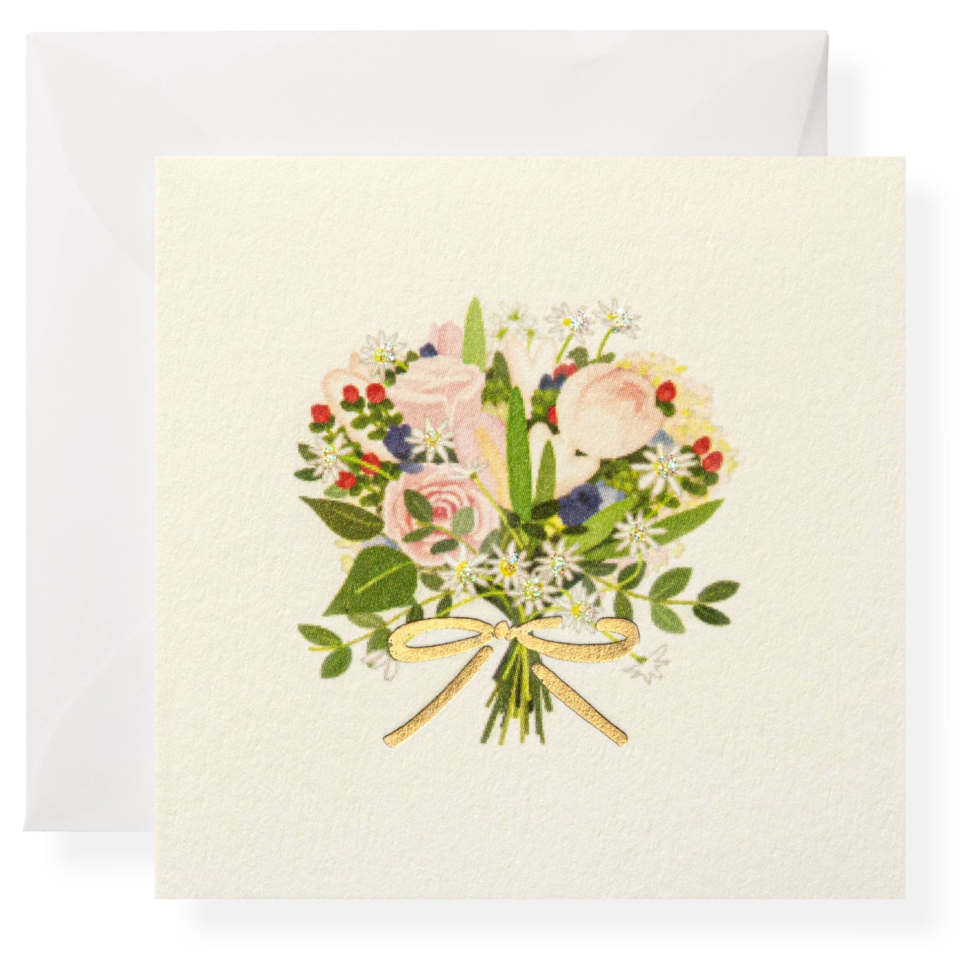 Our Garden Bouquet Gift Enclosure is printed and hand-glittered in Memphis, TN. Hand crafted artwork, full color ink printed on natural white paper, foiled, hand-glittered, and paired with a vellum envelope. Book-folded enclosure card, blank on the inside.