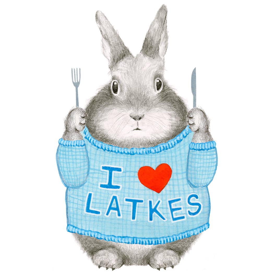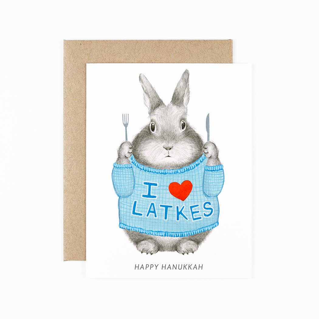 Hand drawn bunny in a painted I Heart Latkes Sweater holding utensils with text that reads "Happy hanukkah". Size a2 (4 ¼" x 5 ½"). Printed on soft white paper and paired with a kraft envelope. Blank interior for personal message. Available as a single card or set of six.