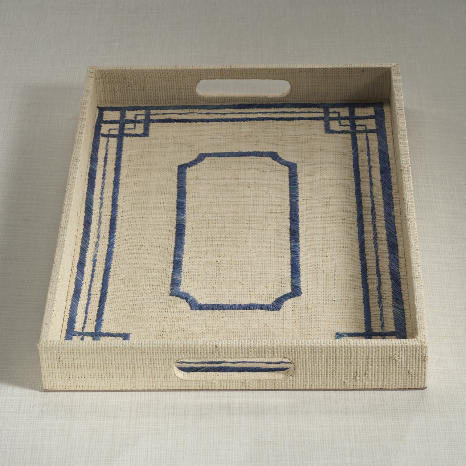 The Riviera Frame Serving Tray is wrapped in handwoven natural raffia and detailed with a tailored blue geometric border that evokes vintage European seaside glamour. Its clean lines and architectural framing give it a polished, collected presence while preserving the warmth of natural texture.