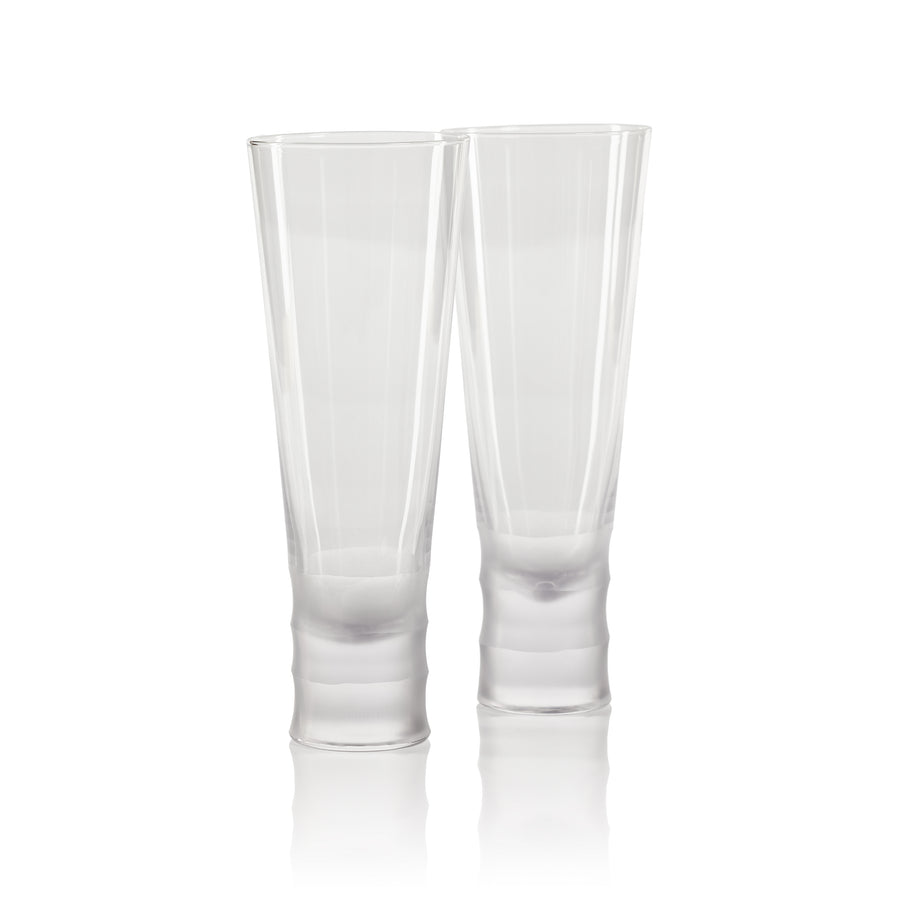 These glasses are tall and slender with slightly flared rims. The lower portion of each glass has a frosted finish, adding an elegant and textured detail to the otherwise smooth, transparent surface. These glasses would be ideal for serving light beers or pilsners.
