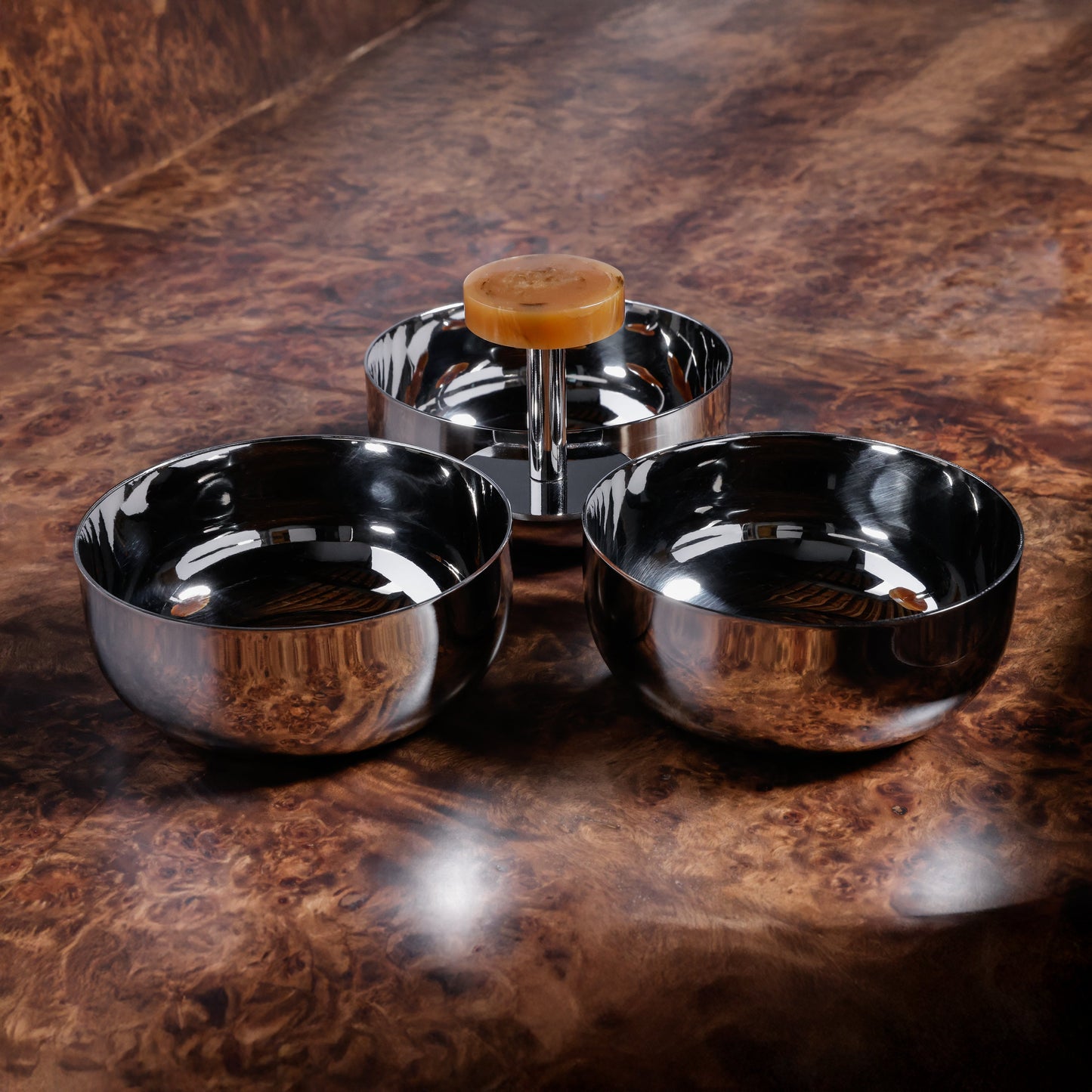 This polished nickel condiment set features three gleaming bowls anchored by a sleek handle with a warm amber marbled top. Ideal for garnishes, snacks, or small bites, it brings a modern, refined touch to any entertaining spread.