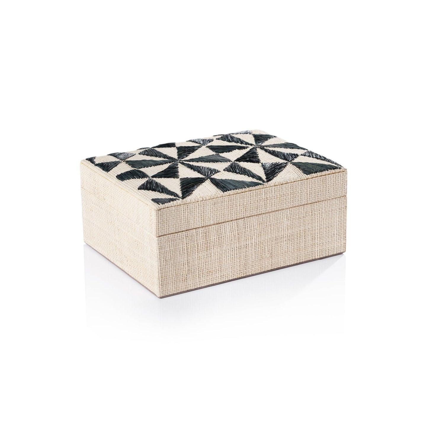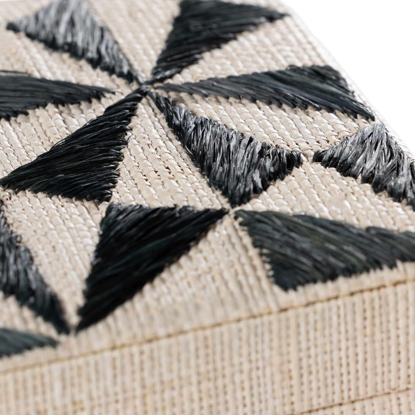 The Tenerife Natural Fiber Raffia Box blends artisanal craftsmanship with bold design. Handwoven from natural raffia, this lidded box features a striking black and cream geometric pattern on top, adding texture and visual interest to any space. Perfect for storing jewelry, keepsakes, or small household items, it’s as functional as it is beautiful—an elegant addition to a dresser, shelf, or console.