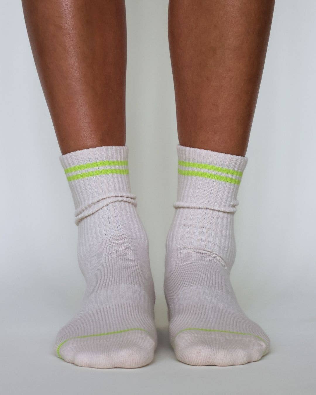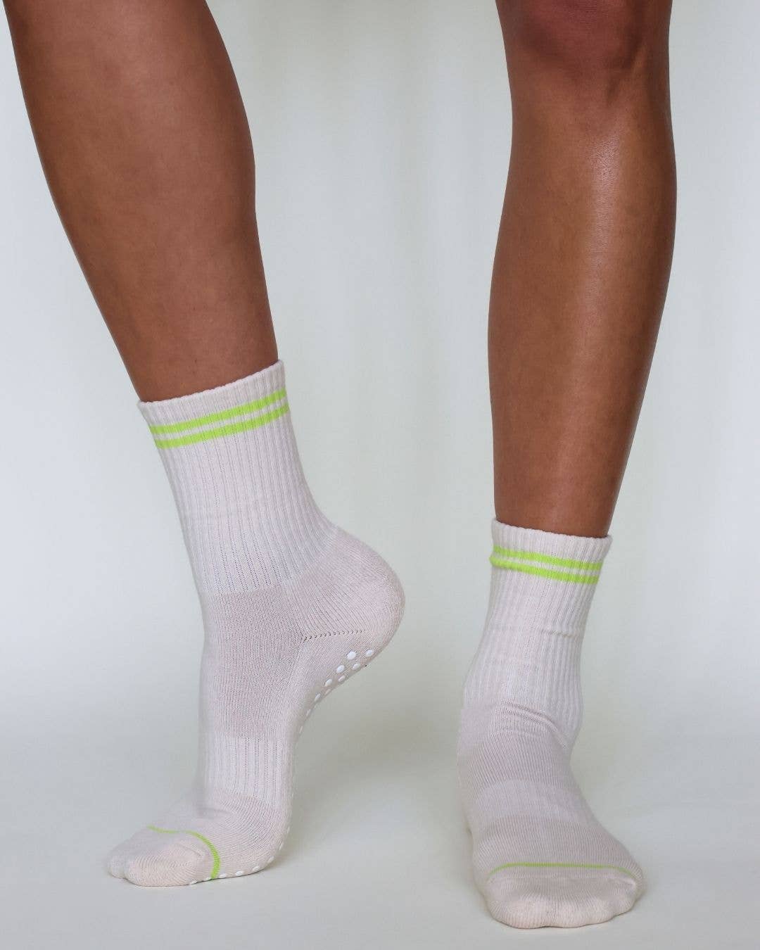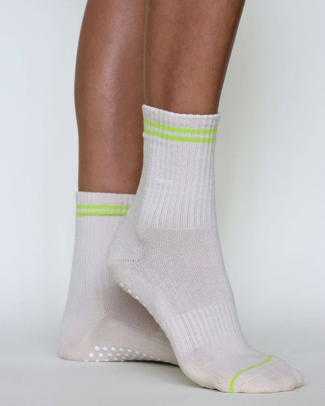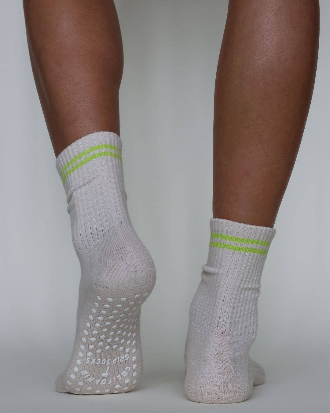 You can't go wrong in classic striped tube grip socks! Off-White grip socks with 2 top stripes in lime and a lime stripe across the toes with white grips with logo design.