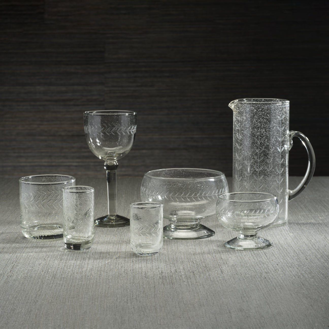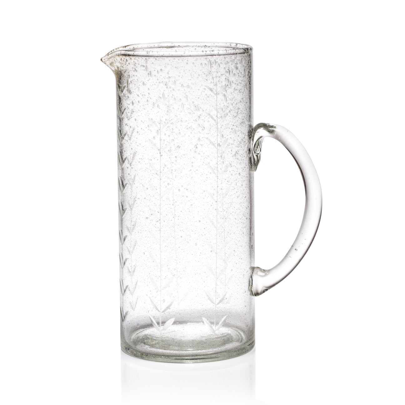 This Tuscan handmade etched glass pitcher features a delicate leaf pattern and a rustic, artisanal finish. Its gracefully curved handle and subtly textured glass add charm, making it perfect for serving beverages with timeless elegance.